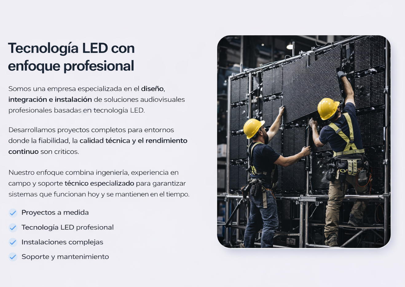 Diseñamos, fabricamos e integramos soluciones completas, incluyendo la pantalla, la estructura, el control y la instalación.